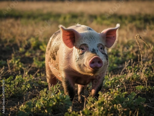 Fototapeta premium Adorable Piglet Portrait in Sunny Farmyard: Exploring Happy, Playful Wildlife in Rural Countryside