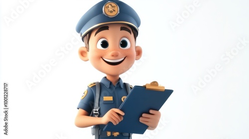 © Napasnan, Fototapeta premium Adorable pilot with a captain's hat, holding a clipboard and smiling brightly, isolated on a clean white background.