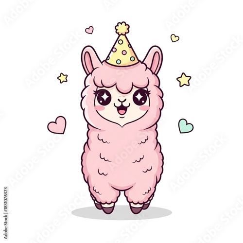 Naklejka premium Adorable pink llama celebrating with a party hat and festive decorations for children's birthdays or whimsical designs, spreading joy and charm