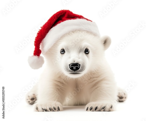 © Angelo, Obraz premium Adorable polar bear cub wearing a festive Santa hat on a white background.