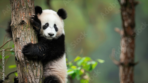 Fototapeta premium Adorable portrait of a panda climbing a tree with a focused gaze.