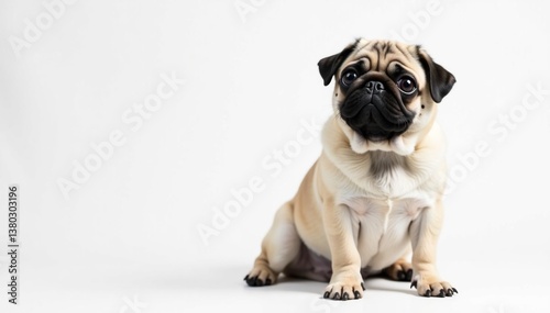 © methinee, Obraz premium Adorable pug dog sits, isolated on white background, fawn, wrinkled, stock photo