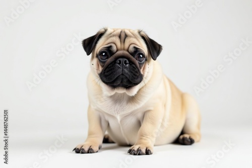 Obraz premium Adorable pug dog sits on white background, looking directly at camera, image,...