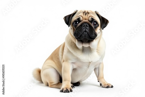 © chaiwat, Obraz premium Adorable pug dog sitting, isolated on white background, canine, cheerful