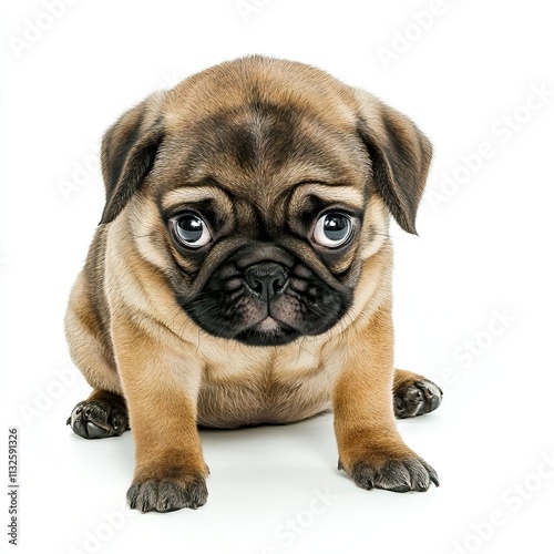 Obraz premium Adorable pug puppy with large eyes sits on floor.