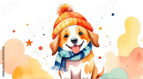 Naklejka premium Adorable puppy in orange hat and scarf with colorful background