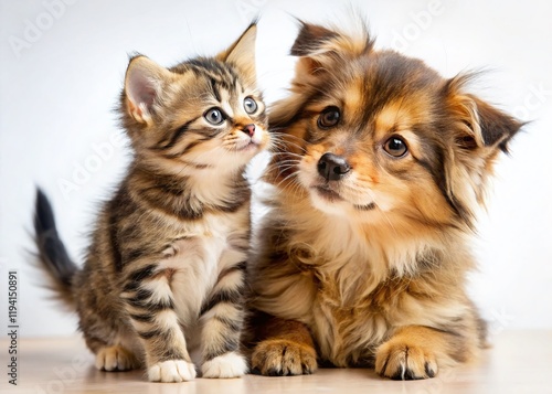 © Arnada, Fototapeta premium Adorable Puppy Kisses Kitten, White Background Stock Photo