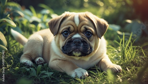 Obraz premium Adorable puppy lying on grass outdoors with greenery, sunlight, and a...