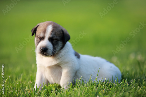 © Selcuk, Obraz premium Adorable puppy lying on the green grass in the garden