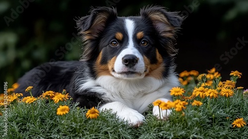 © Ovium, Fototapeta premium Adorable puppy resting amidst flowers