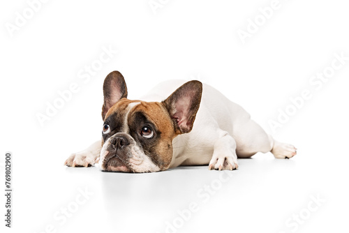 Fototapeta premium Adorable purebred dog, French bulldog lying on floor and looking upwards isolated on white studio background. Concept of animals, domestic pet, care, vet, health, companion