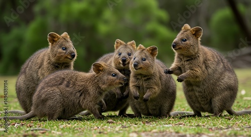 © Dihya, Fototapeta premium Adorable Quokkas Gathering: A heartwarming wildlife encounter in Australia's lush greenery