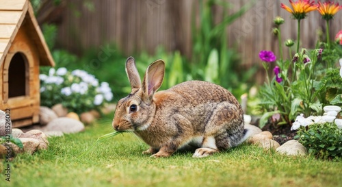 Fototapeta premium Adorable rabbit eating grass in colorful garden