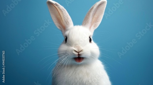 © pakawan, Fototapeta premium Adorable rabbit showcasing a cheerful expression on a bright blue canvas.