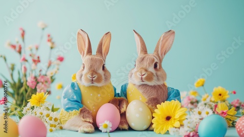 Obraz premium Adorable rabbits photographed with Easter eggs and seasonal flowers against a...