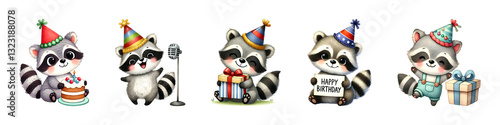 Fototapeta premium Adorable raccoon birthday watercolor illustration design.