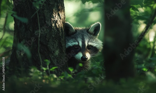 Naklejka premium Adorable raccoon peeking out from behind a tree in a dense forest, soft natural light highlighting its fur and curious expression