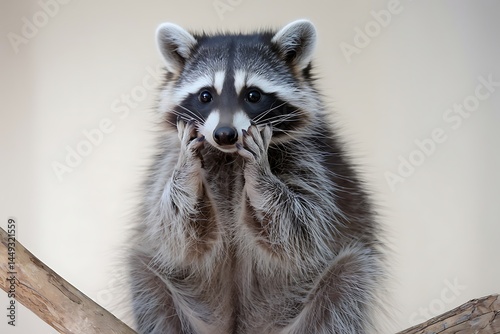 © Gilang, Obraz premium Adorable raccoon with expressive eyes rests on a branch looking surprised