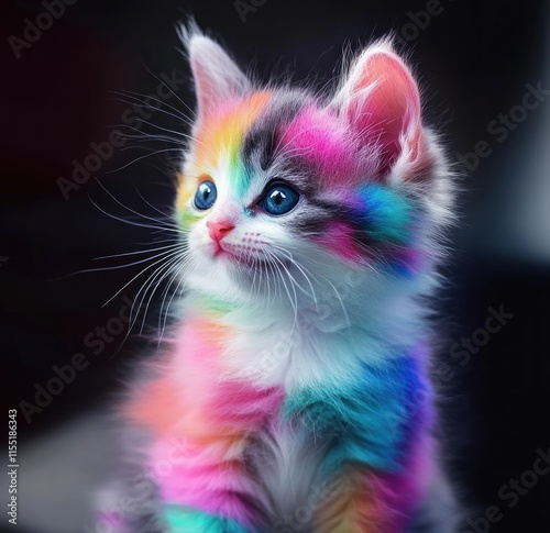 Fototapeta premium Adorable rainbow kitten with vibrant fur, blue eyes, looking up.