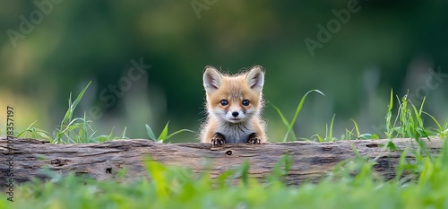 © ngamaz, Fototapeta premium Adorable red fox cub peeking over a fallen log in a grassy meadow.