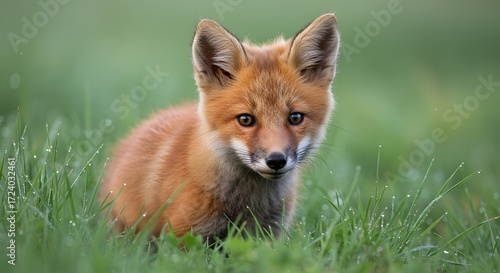 Obraz premium Adorable red fox cub with soft fur sitting in lush green grass, looking...
