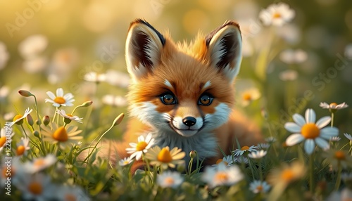 Fototapeta premium Adorable Red Fox Kit Among Daisies in a Sunny Meadow