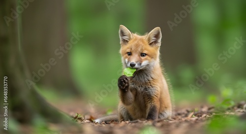 © lananh, Fototapeta premium Adorable red fox kit playfully nibbles leaf in dappled sunlight forest. AI Generated