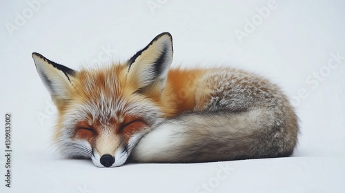 © Harry, Fototapeta premium Adorable Red Fox Sleeping Peacefully in Winter Snow Fluffy Tail Wildlife Photography Nature Animal Image art cute rest cold icon furry white fauna