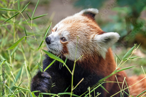 © vitfotography, Fototapeta premium Adorable red panda feeding on bamboo leaf