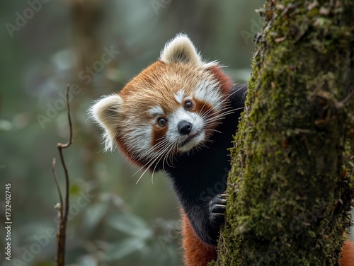 © Karam_Art1, Naklejka premium Adorable red panda peeking curiously from behind a mossy tree trunk in its natural forest habitat, creating a sense of wonder and discovery.