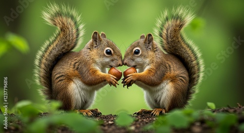 © ahmad, Obraz premium Adorable Red Squirrels Sharing Hazelnuts in a Lush Green Forest Setting