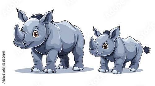 Fototapeta premium Adorable Rhino Mom and Calf: A Charming Cartoon Illustration AI Generated