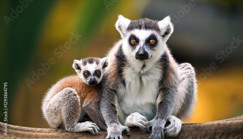© netsay, Obraz premium Adorable RingTailed Lemurs with Babies in Lush Forested Landscape, Showcasing Playful Interactions and Bold Colors in a Tropical Atmosphere