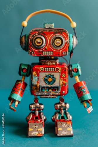 © Eva, Fototapeta premium Adorable robot with music headphones on soft pastel background for text placement