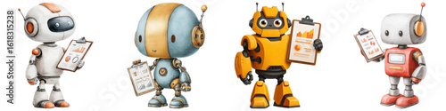 Fototapeta premium Adorable robots holding clipboards with charts, perfect for Business B2B...