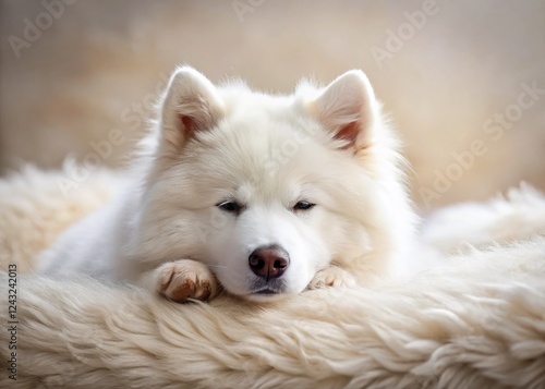 Obraz premium Adorable Samoyed Puppy Sleeping Peacefully on Soft Blanket - Stock Photo