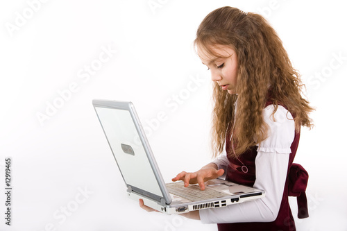 © Vladimir Costas, Fototapeta premium Adorable school girl holding a laptop computer