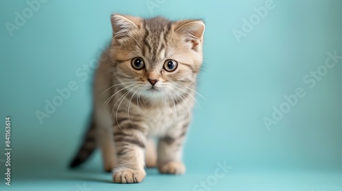 © LookChin AI, Obraz premium Adorable Scottish Fold Kitten Standing on Pastel Blue Background