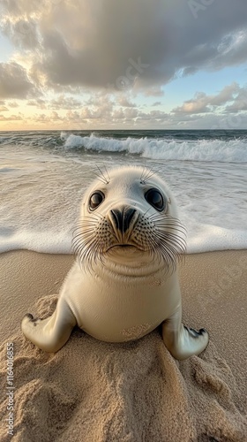Obraz premium Adorable Seal Pup Poses On Sandy Beach At Sunset