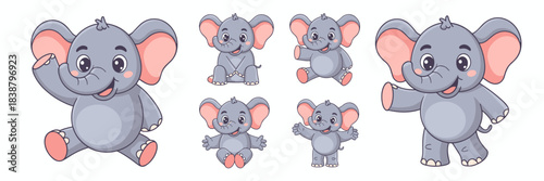 Fototapeta premium Adorable set of baby elephant cartoon characters in multiple playful poses, including smiling, sitting, waving, and standing, isolated vector graphic resources perfect for cheerful children's books, k