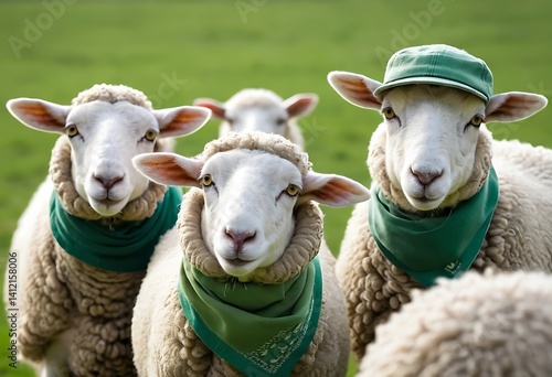 © AdityaGM, Fototapeta premium Adorable Sheep in a Field Wearing Green Bandanas. Generative Ai