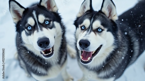 © RABBI, Obraz premium Adorable Siberian Huskies in Winter Wonderland, Close-up of Two Playful Dogs with Striking Blue Eyes, Smiling and Posing in Snowy Landscape