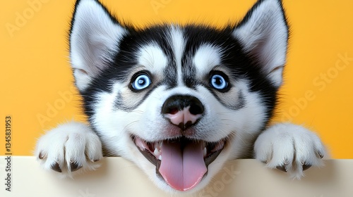 Fototapeta premium Adorable Siberian Husky Puppy with Bright Blue Eyes Happy Expression Yellow...