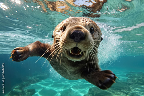 Fototapeta premium Adorable sight of a playful sea otter, gracefully frolicking underwater. Generative Ai, Ai.
