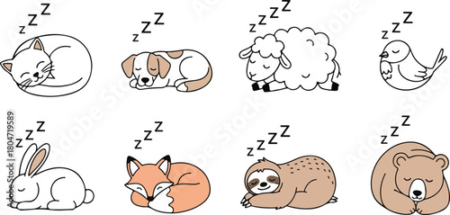 © Pemburu, Naklejka premium Adorable sleeping animals illustration featuring a cat dog sheep bird rabbit fox sloth and bear.