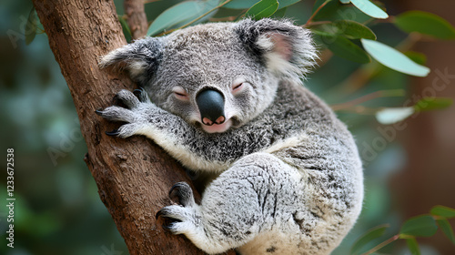 Naklejka premium Adorable Sleeping Koala in Eucalyptus Tree Peacefully Resting in Australian...