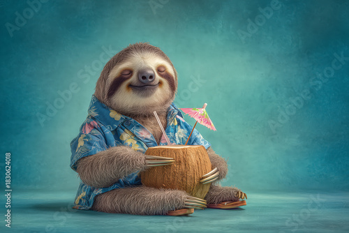 © laurent gendre, Fototapeta premium Adorable sloth enjoying a tropical vacation with a refreshing coconut drink and floral shirt feeling content and relaxed on a sunny day with a smile