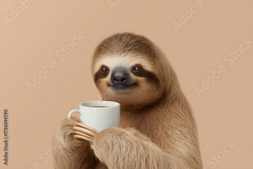 © laurent gendre, Obraz premium Adorable sloth enjoying morning coffee break looks like a perfect social media meme representing relaxation and slow living in today's busy world