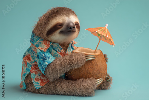 © laurent gendre, Fototapeta premium Adorable sloth enjoying tropical cocktail wearing vibrant Hawaiian shirt, perfect for summer vacation vibes and carefree relaxation concepts, so cute and fun!