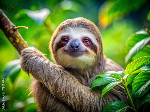 © Adisorn, Fototapeta premium Adorable Sloth Hanging on Tree Branch - Long Exposure Wildlife Photography